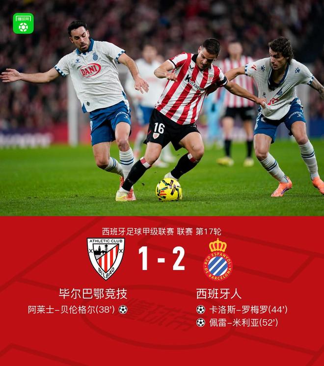北京时间12月23日,西班牙足球甲级联赛第17轮比赛开始。毕尔巴鄂竞技队主场迎战西班牙人队。上半场,亚历克斯·贝伦格尔率先进球。随后,卡洛斯·罗梅罗扳平比分。下半场,多兰助攻,佩林米利亚进球取得领先。最终,西班牙人客场2-1逆转毕尔巴鄂竞技。主赛事第38分钟,贝伦格尔门前捅射破门。毕尔巴鄂竞技1-0西班牙。第44分钟,卡洛斯·罗梅罗弧顶处射门扳平比分。第53分钟,西班牙人1-1,多兰门前右路送出低传。米利亚倒地并进球。西班牙2-1。双方球员在激动人心的时刻进入了比赛。比赛立即开始。第11分钟,戈罗萨维尔主罚禁区。德米特洛维奇将球扑出。第26分钟,德加拉雷塔弧顶处抽射打偏。 , 球错过了邮政。第28分钟,德加拉莱塔身后带球犯规,主裁判出示黄牌警告。第38分钟,贝伦格尔门前射门。毕尔巴鄂竞技1-0西班牙。第44分钟,卡洛斯·罗梅罗弧顶处踢球。射门扳平比分,西班牙队1-1。第53分钟,多兰右路门前送出低传。米利亚倒地射门。西班牙2-1。第65分钟,卡雷拉斯禁区右侧甩头斜射。球有点偏了。球队阵容技术统计